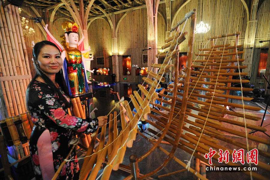 4月29日,演奏人員在越南館內(nèi)演奏竹樂(lè)器為開(kāi)幕演出精心彩排。秦淮 攝