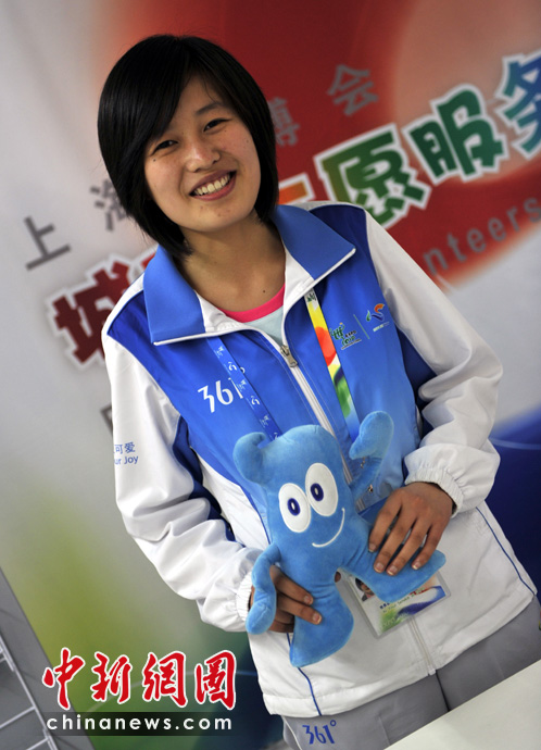 小郭姑娘很熱情地幫助過(guò)往的路人,但面對(duì)鏡頭的時(shí)候卻十分靦腆,不過(guò)還是很配合地與海寶合影,并亮出了“志愿者的微笑”。小郭說(shuō),作為志愿者,要“齊心協(xié)力,心系世博”,并表示盼望世博會(huì)能夠精彩難忘。