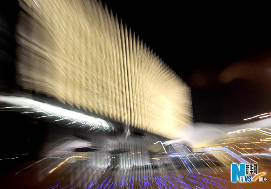 夜色下的世博園,迷離而夢(mèng)幻。圖為媒體中心。圖片來源:新華網(wǎng) 郭毅攝
