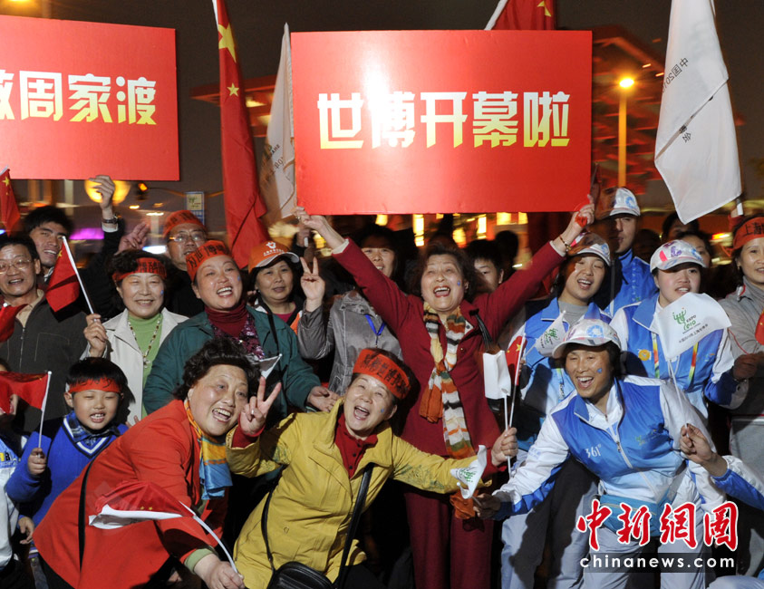 30日晚上8時(shí),2010年上海世博會(huì)正式拉開帷幕。上海周家渡動(dòng)遷居民和志愿者在中國(guó)館前打出“世博開幕啦”的大牌子,高喊:“世博開幕啦!我們開心死啦!”中新網(wǎng)記者 王紅綱 攝