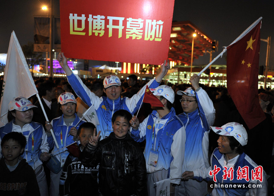 30日晚上8時(shí),2010年上海世博會正式拉開帷幕。上海周家渡動遷居民和志愿者在中國館前打出“世博開幕啦”的大牌子,高喊:“世博開幕啦!我們開心死啦!”中新網(wǎng)記者 王紅綱 攝