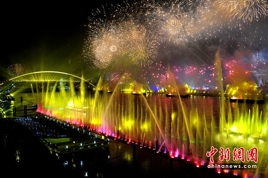 4月30日晚21時28分,在世博會焰火燈光表演開始。萬千煙花爭奇斗妍,黃浦江兩岸綿延3.28公里同時奏響火樹銀花不夜天的華彩世博樂章。圖片來源:中國新聞網