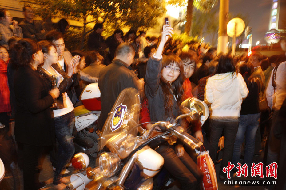 4月30日,上海世博會開幕,黃浦江畔火樹銀花姹紫嫣紅,這座夢想成真城市的千萬居民,在這個注定難忘的夜晚盡情燃燒和釋放著自己的激情。圖為一對情侶在擁擠的外灘合影。中新社發(fā) 盛佳鵬 攝