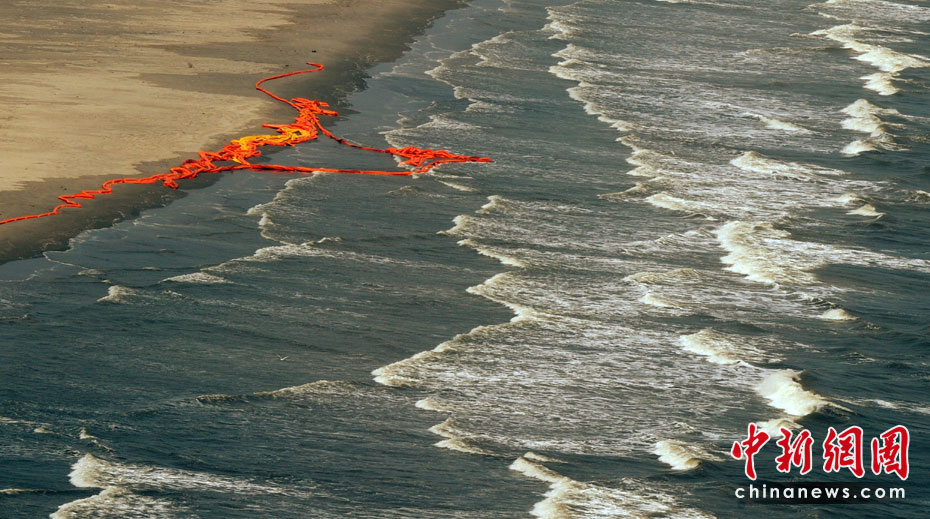 4月30日,在美國路易斯安那州海岸,為阻隔原油擴(kuò)散而設(shè)的護(hù)欄帶被海風(fēng)浪沖到岸邊。當(dāng)天,美國總統(tǒng)奧巴馬下令調(diào)查墨西哥灣石油鉆井平臺(tái)爆炸事件,以避免將來類似事件再次發(fā)生。平臺(tái)爆炸沉沒后泄漏的原油當(dāng)天已漂至美國沿岸。圖片來源:中國新聞網(wǎng)