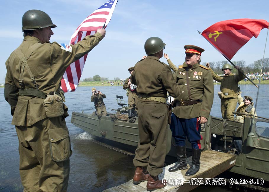 德國當?shù)貢r間4月24日,演員身著二戰(zhàn)時期美蘇軍裝在德國托爾高南部易北河畔的一座小橋上重現(xiàn)當年的“會師”一幕。圖片來源:中國新聞網(wǎng)>>點擊觀看詳細內(nèi)容
