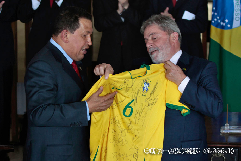 4月28日,巴西總統(tǒng)盧拉在巴西利亞伊塔馬拉蒂宮向來訪的委內(nèi)瑞拉總統(tǒng)查韋斯贈(zèng)送由巴西球星簽名的球衣。圖片來源:中國新聞網(wǎng)>>點(diǎn)擊觀看詳細(xì)內(nèi)容
