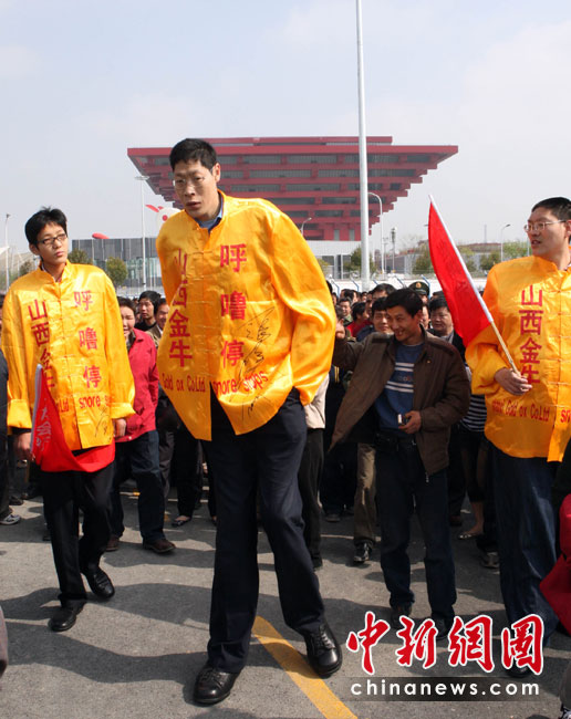 5月1日,三位平均身高2.30米以上的中國(guó)巨人到上海世博園區(qū)參觀中國(guó)館,吸引了眾多游客好奇的目光。當(dāng)日,上海世博會(huì)正式開園。中新社發(fā) 湯彥俊 攝