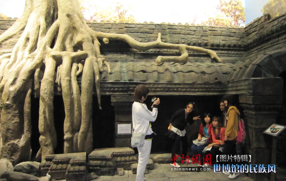 5月1日世博會(huì)開園首日,柬埔寨館內(nèi)復(fù)制的塔布籠寺大樹成中國游客留影最多的場景。塔布籠寺那棵長在建筑中間的大樹因?yàn)槊绹娪啊肮拍果愑啊倍恢袊怂熘?中新社發(fā) 姜煜 攝