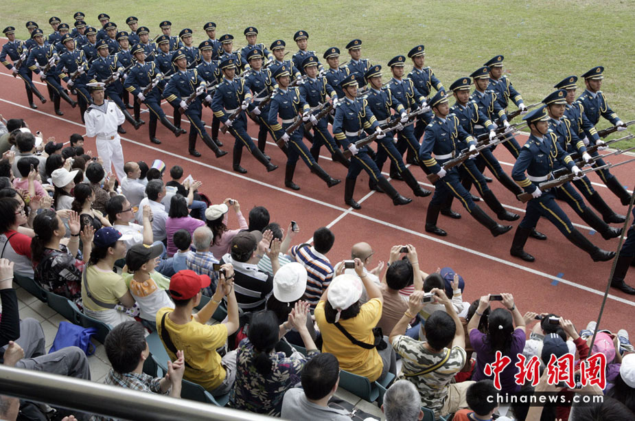 為慶!拔逡弧眹H勞動節(jié),進一步增進與香港社會各界相互溝通與交流,中國人民解放軍駐香港部隊5月1日開放了昂船洲軍營。圖為香港市民們爭睹駐港部隊三軍儀仗隊風姿。中新社發(fā) 張勤 攝