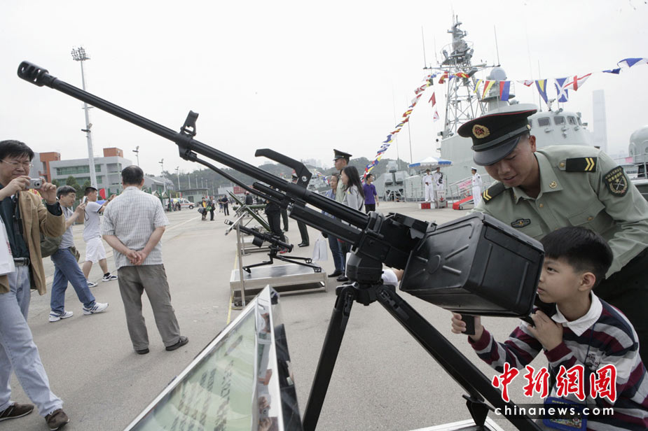 為慶!拔逡弧眹(guó)際勞動(dòng)節(jié),進(jìn)一步增進(jìn)與香港社會(huì)各界相互溝通與交流,中國(guó)人民解放軍駐香港部隊(duì)5月1日開(kāi)放了昂船洲軍營(yíng),共有約13000名市民前往參觀。圖為香港市民近距離參觀武器展示。中新社發(fā) 張勤 攝