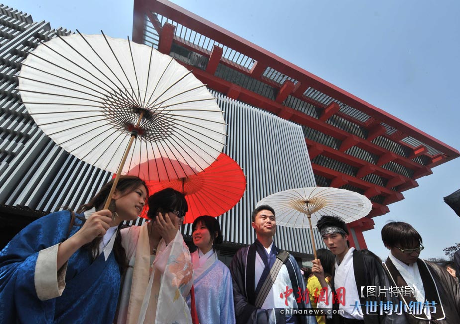 5月1日,上海世博會正式開園,當(dāng)日有20萬人次的游客參觀了世博園。世博首日,許許多多的小細節(jié)都帶給人一種全新的體驗。圖為大學(xué)生身著古裝游覽中國館。中新社發(fā) 賈國榮 攝