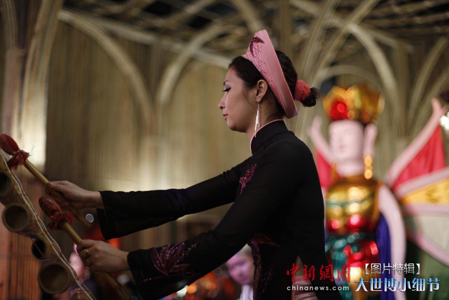 5月1日,上海世博會正式開園,當(dāng)日有20萬人次的游客參觀了世博園。世博首日,許許多多的小細(xì)節(jié)都帶給人一種全新的體驗(yàn)。圖為越南館為入館參觀的來賓演奏獨(dú)特的竹制樂器。中新社發(fā) 盛佳鵬 攝