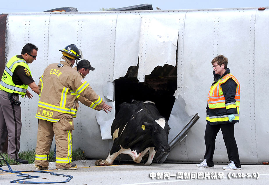 29日(周四),一輛運(yùn)送奶牛的卡車在威斯康星洲公路上發(fā)生事故。