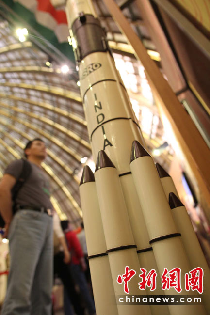 5月2日,觀眾在上海世博會印度館參觀印度的“一箭十星”火箭模型。2008年4月,印度一舉把10顆衛(wèi)星送入軌道,這是世界首次“一箭十星”成功發(fā)射。中新社發(fā) 蘇丹 攝