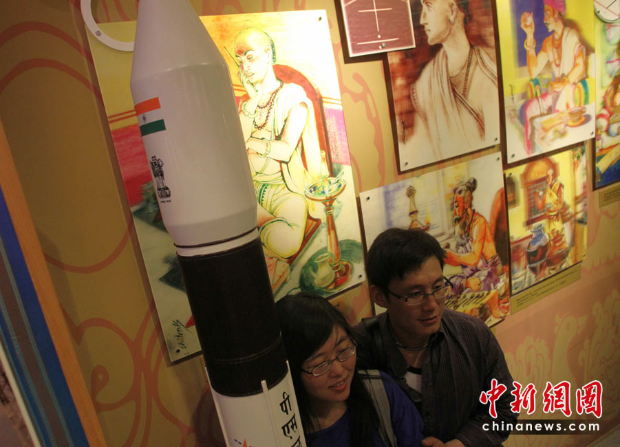 5月2日,觀眾在上海世博會(huì)印度館參觀印度的“一箭十星”火箭模型。中新社發(fā) 蘇丹 攝