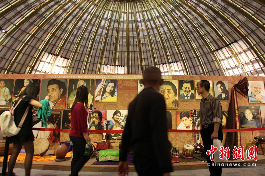 5月2日,游客在上海世博園印度館參觀,背景板上是印度不同職業(yè)人群的肖像。印度借此展示其“多樣的和諧性”。 中新社發(fā) 蘇丹 攝
