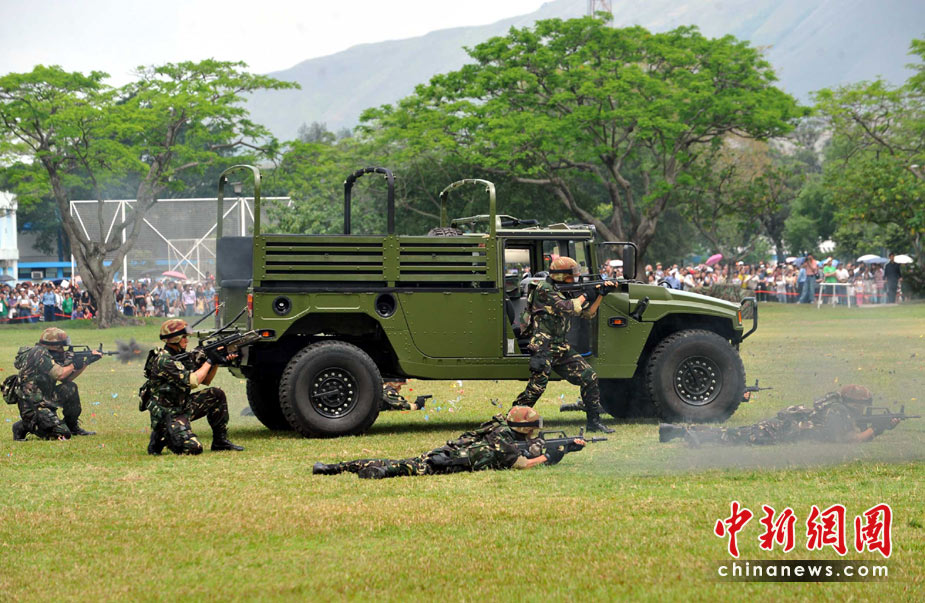 為慶!拔逡弧眹(guó)際勞動(dòng)節(jié),進(jìn)一步增進(jìn)與香港社會(huì)各界相互溝通與交流,中國(guó)人民解放軍駐香港部隊(duì)5月2日開(kāi)放了石崗軍營(yíng)。圖為駐港部隊(duì)“獵人戰(zhàn)斗”表演。 中新社發(fā) 鄧慶樂(lè) 攝