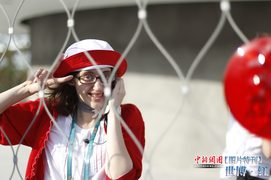 紅色象征著熱量與活力,紅色也象征著興奮與激情,在世博園區(qū)內(nèi)游覽,總會(huì)有一抹濃艷的紅色闖入到記者鏡頭之中,讓世博變得更加火辣。圖為一位外國(guó)游客向面對(duì)鏡頭問(wèn)好。中新社記者 盛佳鵬 攝