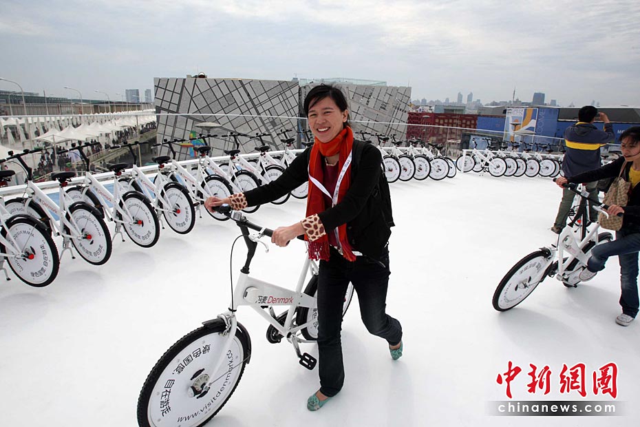 5月2日,上海世博會是第一個正式提出“低碳世博”理念的世博會,圍繞著這樣的理念,上海世博園區(qū)內(nèi)的低碳元素比比皆是。圖為游客在丹麥館內(nèi)享受自行車帶來的樂趣。中新社發(fā) 湯彥俊 攝