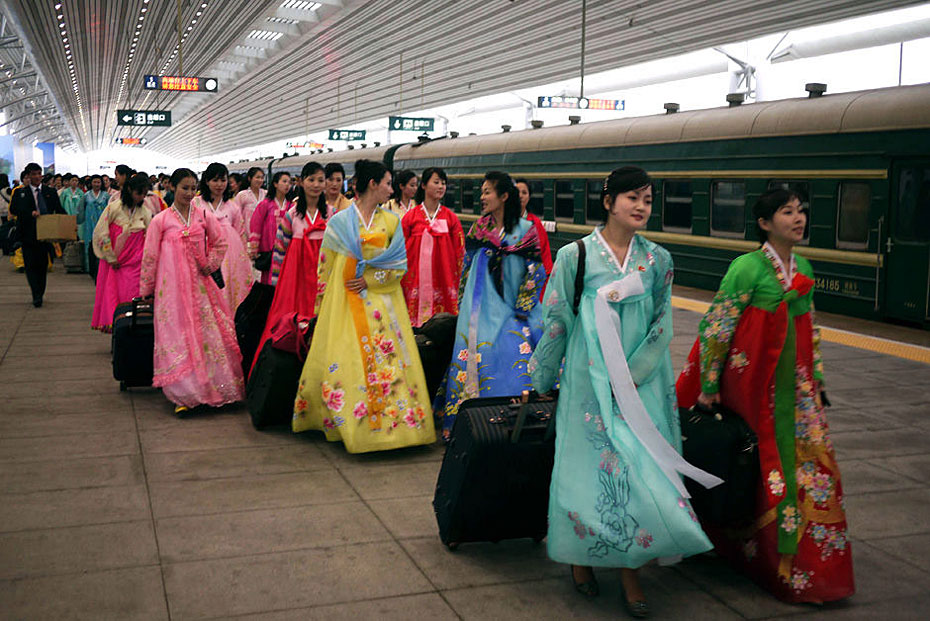 5月2日,載著198名朝鮮紅樓夢(mèng)劇組演員的專(zhuān)列駛?cè)氲|口岸。由朝鮮國(guó)家級(jí)藝術(shù)團(tuán)-血海歌劇團(tuán)創(chuàng)作的歌舞劇《紅樓夢(mèng)》將于5月6日至9日登陸北京電視臺(tái)大劇院,這個(gè)超大演員陣容亦創(chuàng)下近年來(lái)華國(guó)外演出人數(shù)之最。圖片來(lái)源:新華網(wǎng)
