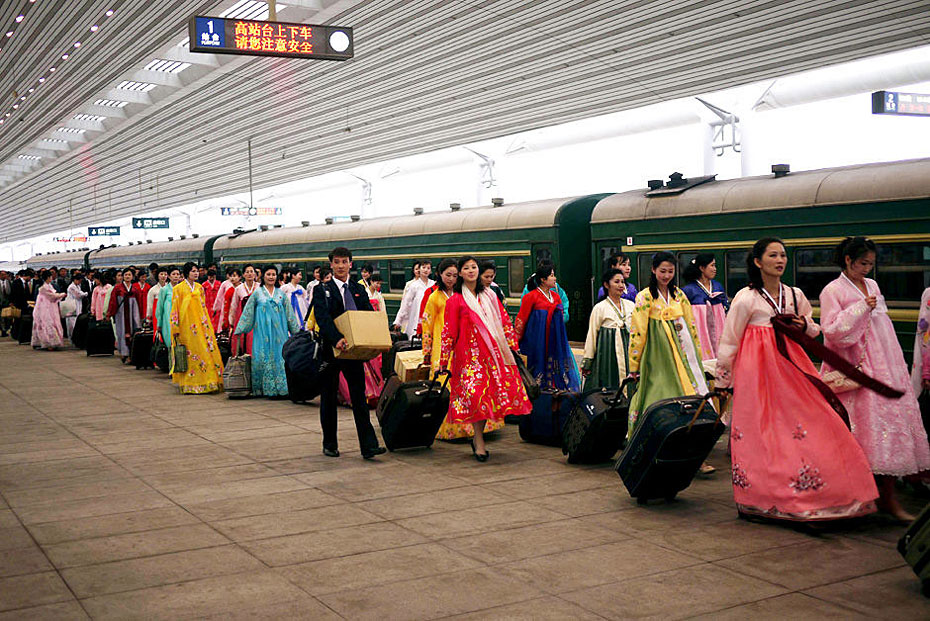 5月2日,載著198名朝鮮紅樓夢(mèng)劇組演員的專列駛?cè)氲|口岸。由朝鮮國(guó)家級(jí)藝術(shù)團(tuán)-血海歌劇團(tuán)創(chuàng)作的歌舞劇《紅樓夢(mèng)》將于5月6日至9日登陸北京電視臺(tái)大劇院,這個(gè)超大演員陣容亦創(chuàng)下近年來(lái)華國(guó)外演出人數(shù)之最。圖片來(lái)源:新華網(wǎng)