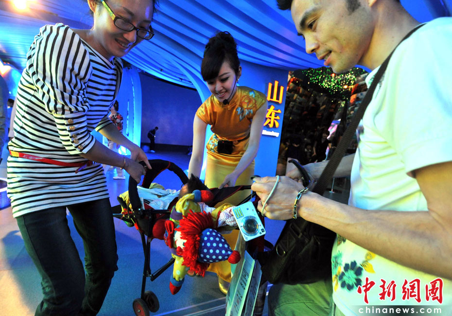 5月3日,上海世博會中國山東館一位禮儀小姐始終笑容可掬,許多參觀者都喜歡與外秀內(nèi)慧的她拍一張留影照。當一對夫婦推著嬰兒車經(jīng)過時,她迅速上前幫助抬下階梯。她因而享有全場最善解人意的禮儀小姐美稱。中新社發(fā) 賈國榮 攝