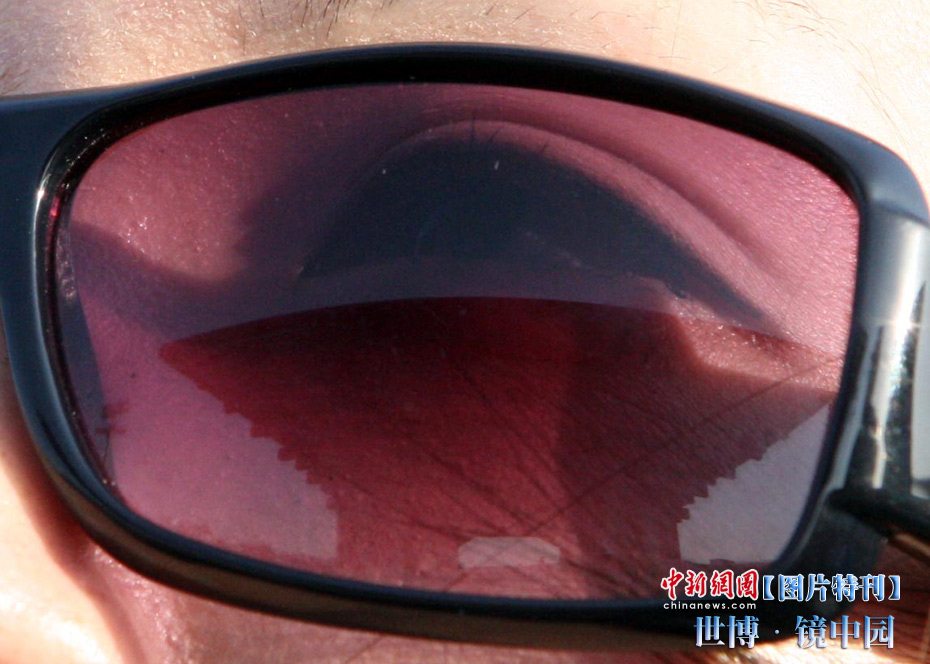 世博園開(kāi)園3天,天氣一直晴熱,不少游客帶起墨鏡來(lái)遮擋刺目的陽(yáng)光,從鏡片的折射中看世博園,別有一番趣味。中新社記者 湯彥俊攝