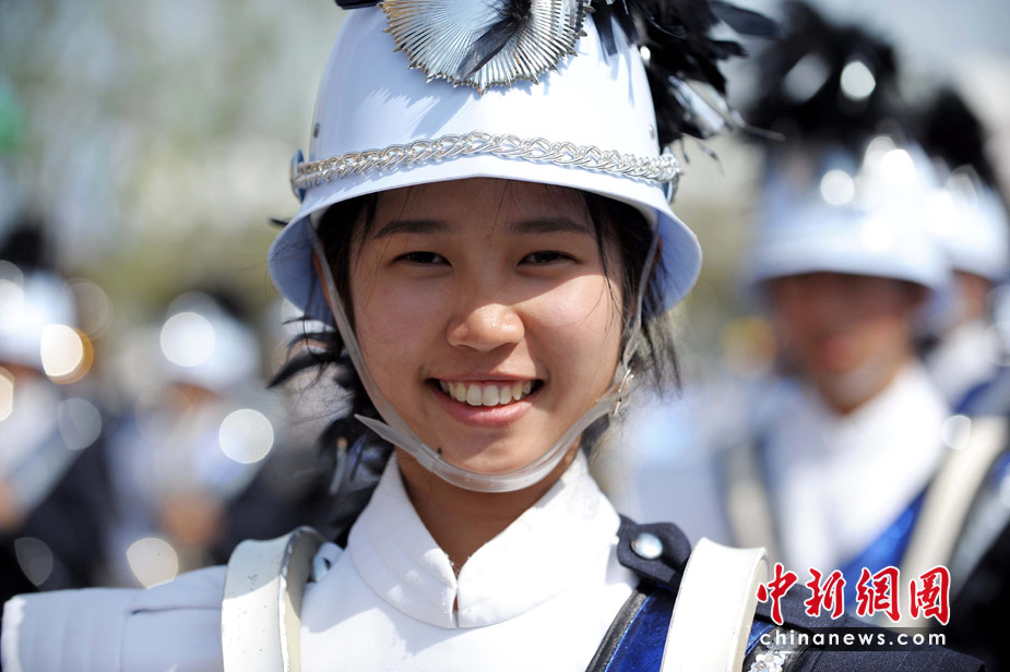 來自泰國南邦甘拉雅尼步操樂團(tuán)的美少女,在上海世博會(huì)園區(qū)舉行的“歡樂盛裝大巡游”中引人注目。中新社發(fā) 陳文 攝