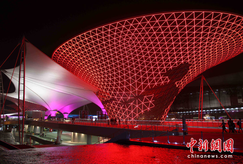 夜幕下的上海世博園區(qū)處處流露光華與璀璨,世博軸上的“陽(yáng)光谷”成為一個(gè)個(gè)流光溢彩的“夜光杯”,以不同色調(diào)交織成流動(dòng)的光影旋律,給游客們帶來(lái)難以忘懷的感受。中新社發(fā) 宗金柱 攝