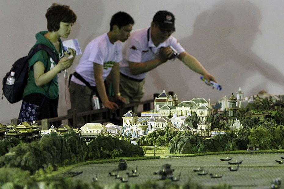 5月4日,游客在參觀縮微版“圓明園”。近日,一座“全景式巨型立雕圓明園”在上海世博會世界貿(mào)易中心協(xié)會館亮相。這座縮微版的“圓明園”以1比150的比例制作而成,再現(xiàn)了全盛時(shí)期的圓明園雄偉壯觀的全景。圖片來源:新華網(wǎng) 裴鑫 攝