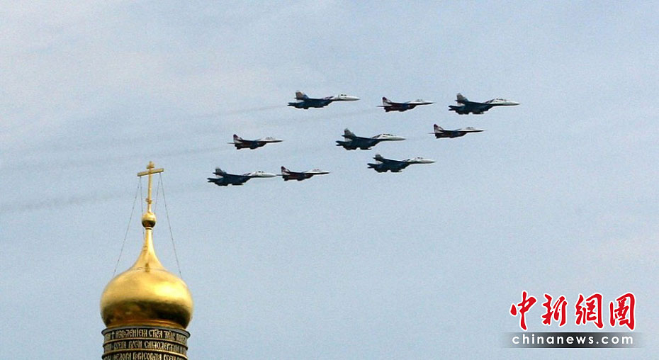 當(dāng)?shù)貢r間5月4日,在俄羅斯首都莫斯科,參加彩排的戰(zhàn)機(jī)編隊(duì)飛過紅場上空。俄羅斯將于5月9日隆重紀(jì)念衛(wèi)國戰(zhàn)爭勝利65周年。圖片來源:中國新聞網(wǎng)