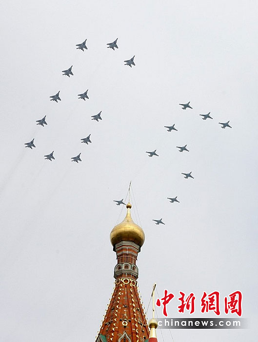 當(dāng)?shù)貢r(shí)間5月4日,在俄羅斯首都莫斯科,參加彩排的戰(zhàn)機(jī)編隊(duì)飛過(guò)紅場(chǎng)上空。俄羅斯將于5月9日隆重紀(jì)念衛(wèi)國(guó)戰(zhàn)爭(zhēng)勝利65周年。圖片來(lái)源:中國(guó)新聞網(wǎng)