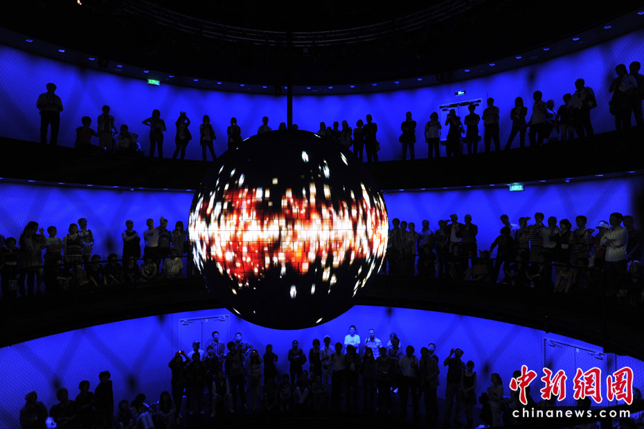 德國(guó)館的高潮就是它的最后部分“動(dòng)力之源”?梢匀菁{600人的動(dòng)力之源大廳圓形環(huán)廊是一個(gè)圓錐形空間,中間懸掛著一個(gè)重達(dá)1.5噸、直徑達(dá)3米的巨大金屬球,四周則有一圈供游客駐足的走廊。黑漆漆的大廳里,兩個(gè)虛擬主持人邀請(qǐng)觀眾同時(shí)大聲吶喊。隨著吶喊聲的加大,動(dòng)力球慢慢擺動(dòng)起來(lái),聲音越大擺動(dòng)幅度越大,甚至繞圈飛行。圓球表面40萬(wàn)根發(fā)光的LED管,逐漸閃現(xiàn)出德國(guó)人對(duì)未來(lái)城市生活的暢想畫(huà)面。這是一場(chǎng)7分鐘的互動(dòng)體驗(yàn)。在這里觀眾才是主角。中新網(wǎng)記者 王紅綱 攝