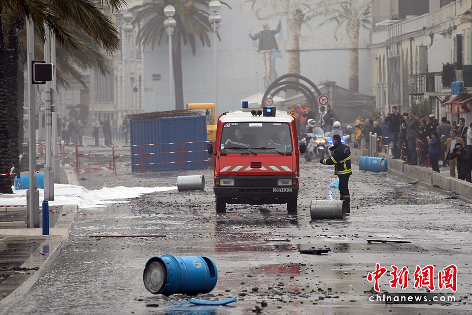 近日,在法國南部城市尼斯,巨浪襲擊城市的海岸后造成城市道路癱瘓。法國南部部分地區(qū)遭遇大風(fēng)和巨浪,使當(dāng)?shù)亟煌ê凸╇娛艿讲煌潭鹊挠绊。圖片來源:中國新聞網(wǎng)