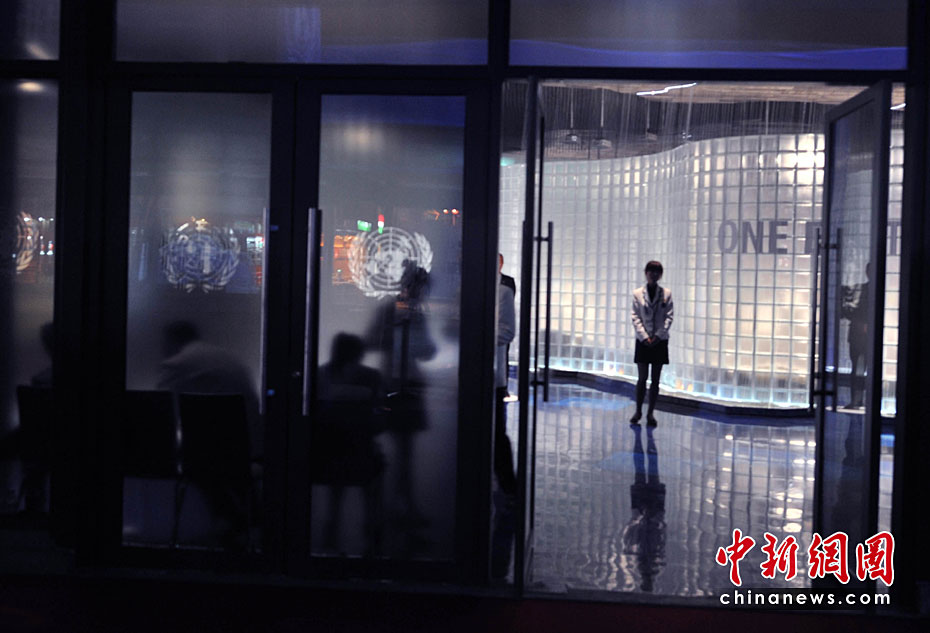 一所藍(lán)色的簡樸平房,在5月開園的上海世博會大道邊上,極不顯眼。但是,聯(lián)合國聯(lián)合館的鮮明會標(biāo),特別吸引人。這個展館集中了世界衛(wèi)生組織、世界銀行和聯(lián)合國的兒童基金會、糧農(nóng)組織、教科文組織等22個機構(gòu)。圖片來源:中國新聞網(wǎng) 賈國榮 攝