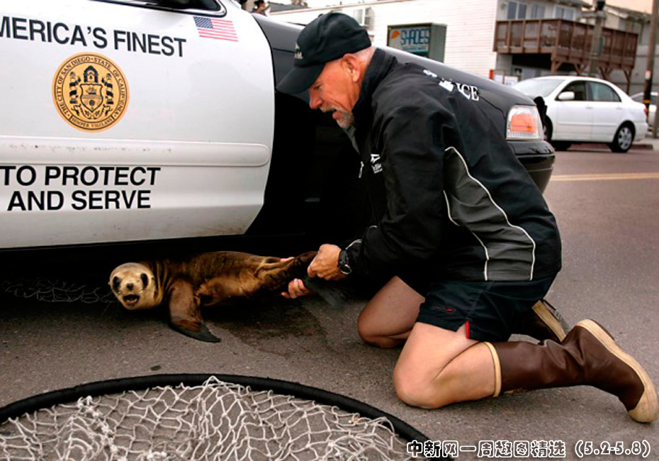 5月5日,在加利福尼亞州,動(dòng)物護(hù)理專(zhuān)家羅賓森把一頭小海豹從圣地亞哥警車(chē)下拖出。小海豹之前在另一輛車(chē)下被發(fā)現(xiàn),看到警察要捉它就躲到了這輛警車(chē)下。圖片來(lái)源:中國(guó)新聞網(wǎng)>>點(diǎn)擊觀(guān)看詳細(xì)內(nèi)容