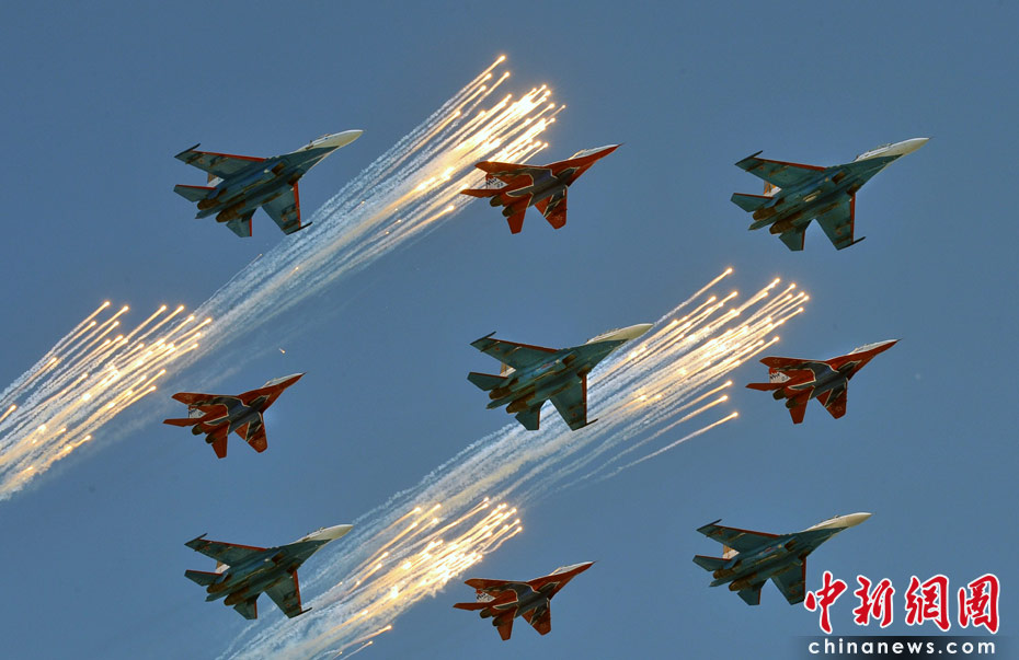 5月9日,俄羅斯在莫斯科紅場(chǎng)舉行盛大的閱兵式,慶祝衛(wèi)國(guó)戰(zhàn)爭(zhēng)勝利65周年。莫斯科時(shí)間5月9日上午10點(diǎn)(北京時(shí)間9日下午2點(diǎn))許,閱兵式正式開始。圖為空中梯隊(duì)飛越紅場(chǎng)上空。