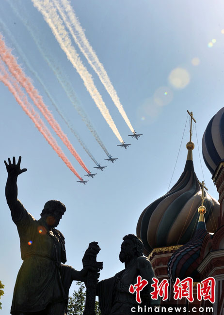 5月9日,俄羅斯在莫斯科紅場舉行盛大的閱兵式,慶祝衛(wèi)國戰(zhàn)爭勝利65周年。莫斯科時間5月9日上午10點(北京時間9日下午2點)許,閱兵式正式開始。圖為空中梯隊飛越紅場上空。