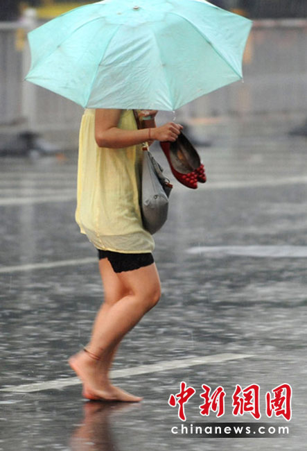 未來三天,青藏高原中東部、西南地區(qū)、江漢、江淮、江南、華南等地將持續(xù)陰雨天氣,其中,廣西南部、廣東大部、江西南部、福建南部、海南西北部、湖北大部、湖南北部、重慶大部等地有大雨或暴雨,局地有大暴雨。圖為5月9日傍晚,佛山市禪城區(qū)文華北路,一個女孩光著腳在雨中前行。崔景印 攝