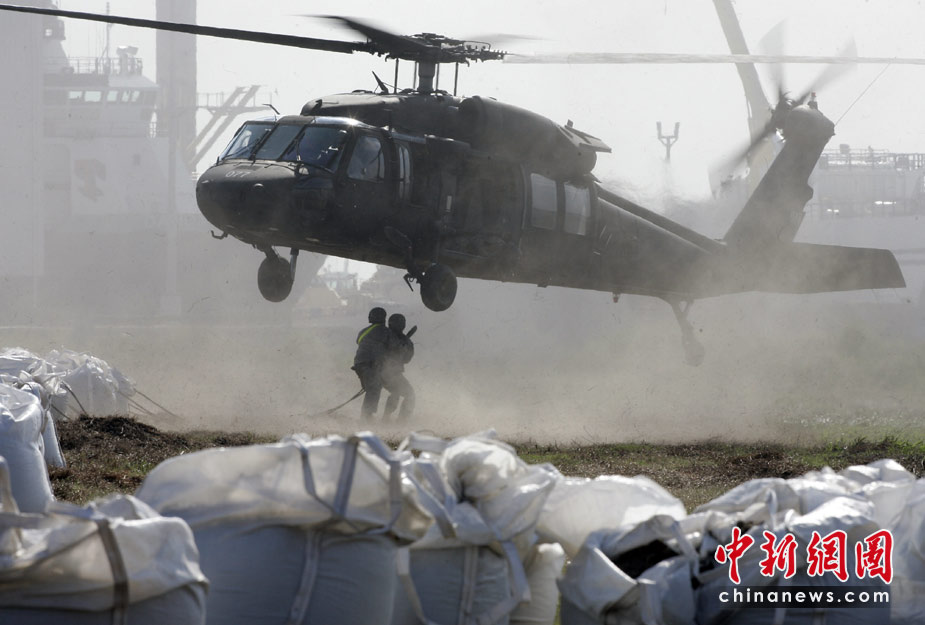 5月11日,美國(guó)路易斯安那州,國(guó)民警衛(wèi)隊(duì)用直升機(jī)向河口運(yùn)載沙袋,試圖阻止海上的油污進(jìn)入內(nèi)河。