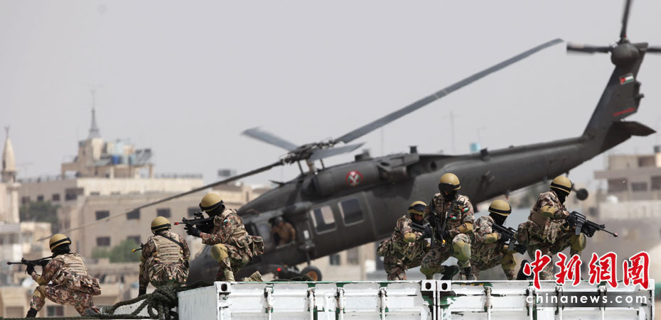 5月11日,約旦特種部隊(duì)在安曼空軍基地附近舉行演習(xí),為特種作戰(zhàn)部隊(duì)展覽會(huì)(SOFEX)開幕式助興。該展覽會(huì)為期4天,展覽主題包括國(guó)家安全及反恐措施。圖片來(lái)源:中國(guó)新聞網(wǎng)