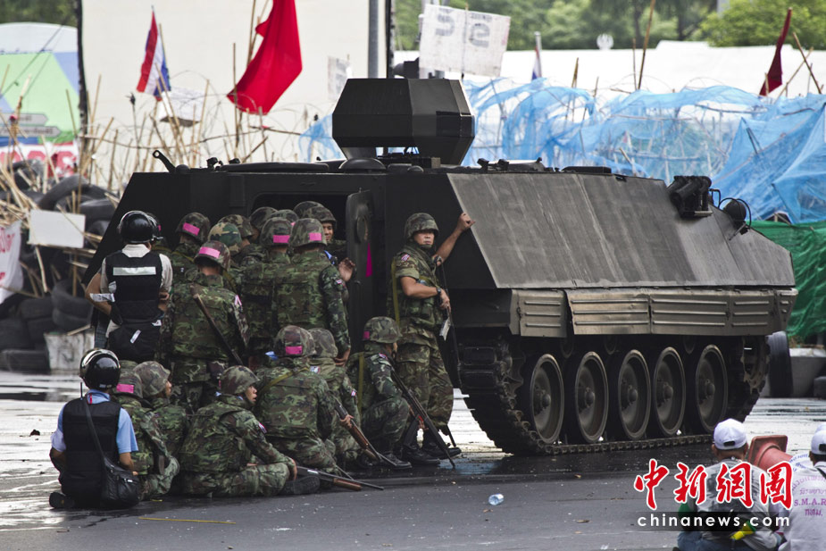 19日清晨,數(shù)百名軍警在武裝車輛的掩護(hù)下向反政府示威者在曼谷的大本營(yíng)聚集。自上周四紅衫軍與政府在曼谷爆發(fā)沖突以來,已經(jīng)導(dǎo)致39人死亡,數(shù)百人受傷。
