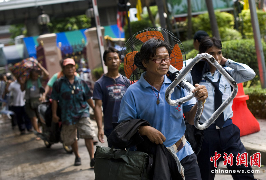 5月20日,數(shù)千名結(jié)束集會的外地“紅衫軍”示威者在曼谷拉差巴頌地區(qū)接受登記和安全檢查后,乘坐政府安排的車輛返回家鄉(xiāng)。