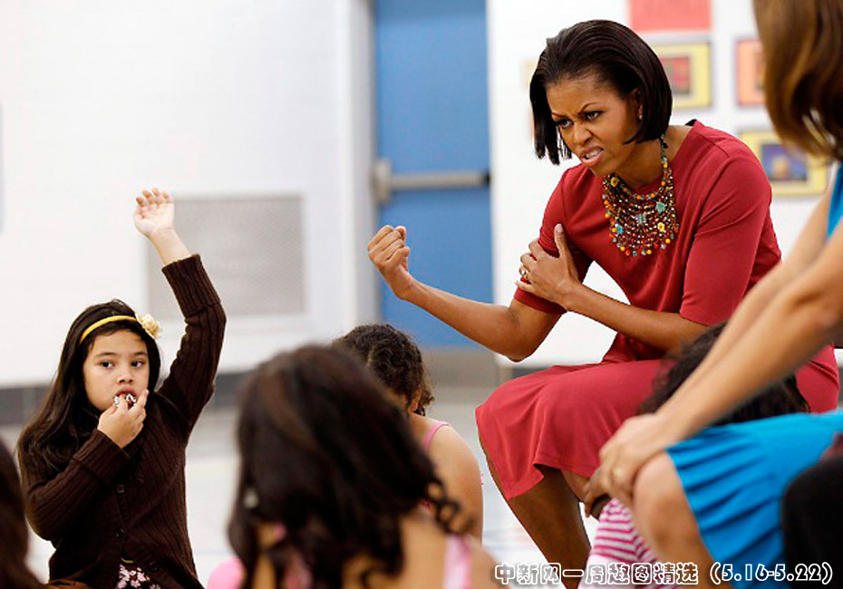 近日,美國第一夫人米歇爾·奧巴馬到馬里蘭州銀泉小學(xué)看望學(xué)生。在體育課上,米歇爾彎曲胳膊繃緊肌肉。圖片來源:中國新聞網(wǎng)