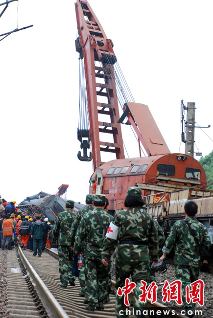 5月23日凌晨2時(shí)10分,滬昆鐵路江西東鄉(xiāng)段發(fā)生一起客運(yùn)列車(chē)脫線事故,截至上午9時(shí),已有10人遇難,車(chē)內(nèi)乘客全部被轉(zhuǎn)移,現(xiàn)場(chǎng)救援工作正在緊張進(jìn)行。事故發(fā)生后,南京軍區(qū)武警,江西省消防、交警,中鐵電氣化局、醫(yī)療等部門(mén)立即組織近萬(wàn)名人員參與搶險(xiǎn)救災(zāi),目前現(xiàn)場(chǎng)已有10余臺(tái)挖土機(jī)和吊車(chē)參與救援。中新社發(fā) 劉占昆 攝