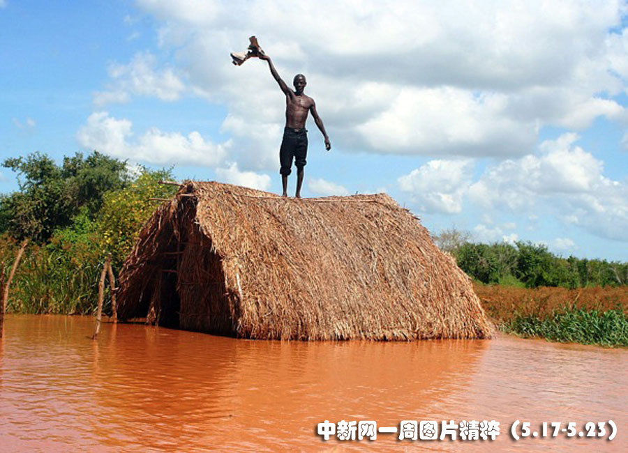 5月20日肯尼亞一名村民的茅草房被水淹沒,他站在房頂尋求幫助。一個(gè)電廠開閘放水導(dǎo)致塔納河決堤,造成100多人無(wú)家可歸。