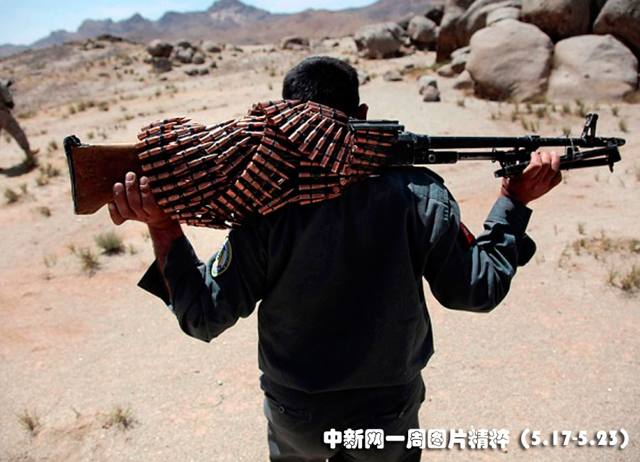 5月20日在阿富汗坎大哈,一名阿富汗國民警察扛著一挺機關(guān)槍和美國士兵一起巡邏。