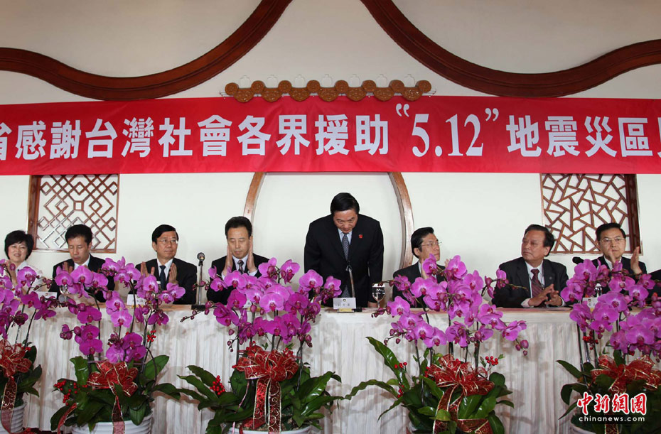 5月24日下午,“四川省感謝臺(tái)灣社會(huì)各界援助‘5.12’地震災(zāi)區(qū)見面會(huì)”在臺(tái)北圓山飯店舉行,首度訪臺(tái)的中共四川省委書記劉奇葆于致辭時(shí),兩度鞠躬感謝臺(tái)灣同胞積極援助四川災(zāi)區(qū),展現(xiàn)出血濃于水的同胞大愛。 中新網(wǎng)記者董會(huì)峰攝