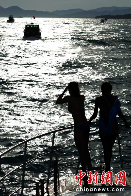 5月23日,全球64位比基尼佳麗們參加了三亞“清涼一夏 文化三亞”夏季旅游促銷(xiāo)活動(dòng)的啟動(dòng)儀式及系列主題活動(dòng),與三亞市民和游客親密接觸,跳起了歡快的竹竿舞,并乘豪華游艇暢游三亞。中新社記者 富田 攝