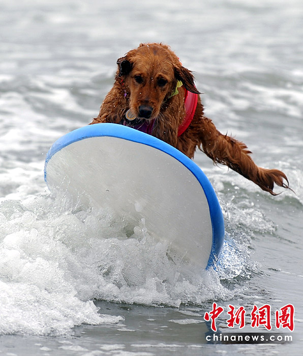5月22日,美國加利福尼亞州圣迭戈舉行了一場妙趣橫生的狗狗沖浪比賽。圖片來源:中國新聞網(wǎng)